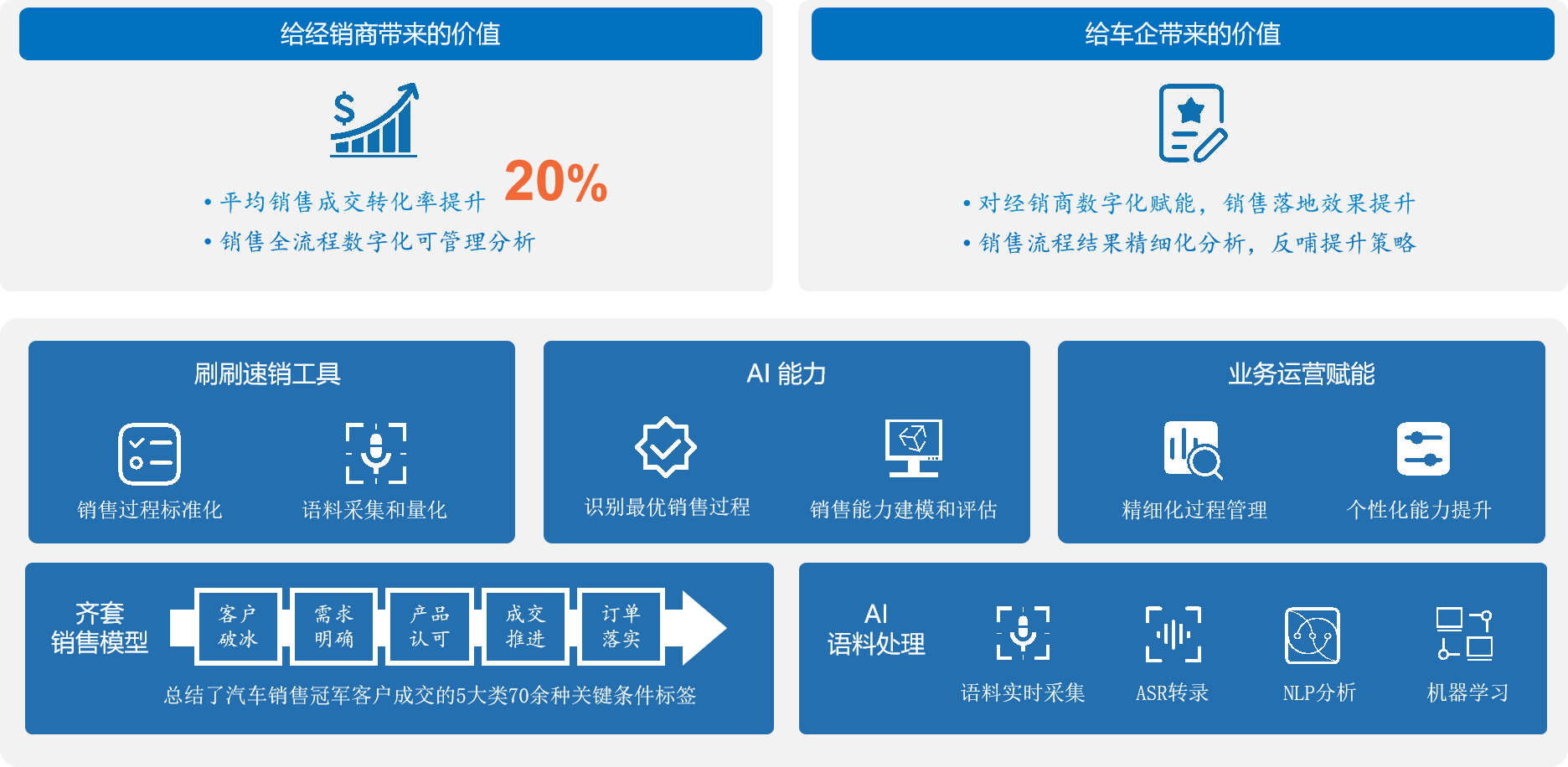 独创的“齐套销售管理方法”,,,利用 AI 语音智能系统对近千万条对话进行分析,,,,总结了客户成交的5大类70余种关键条件,,并在此基础上发展出来一套销售模型。。